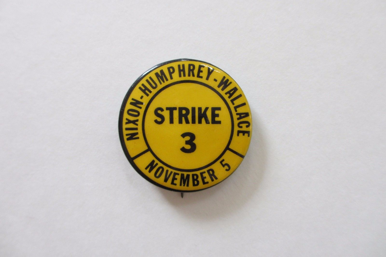 Title (ebay affiliate link): Nixon 1968 Political Button-Strike 3-Nixon-Humphrey-Wallace