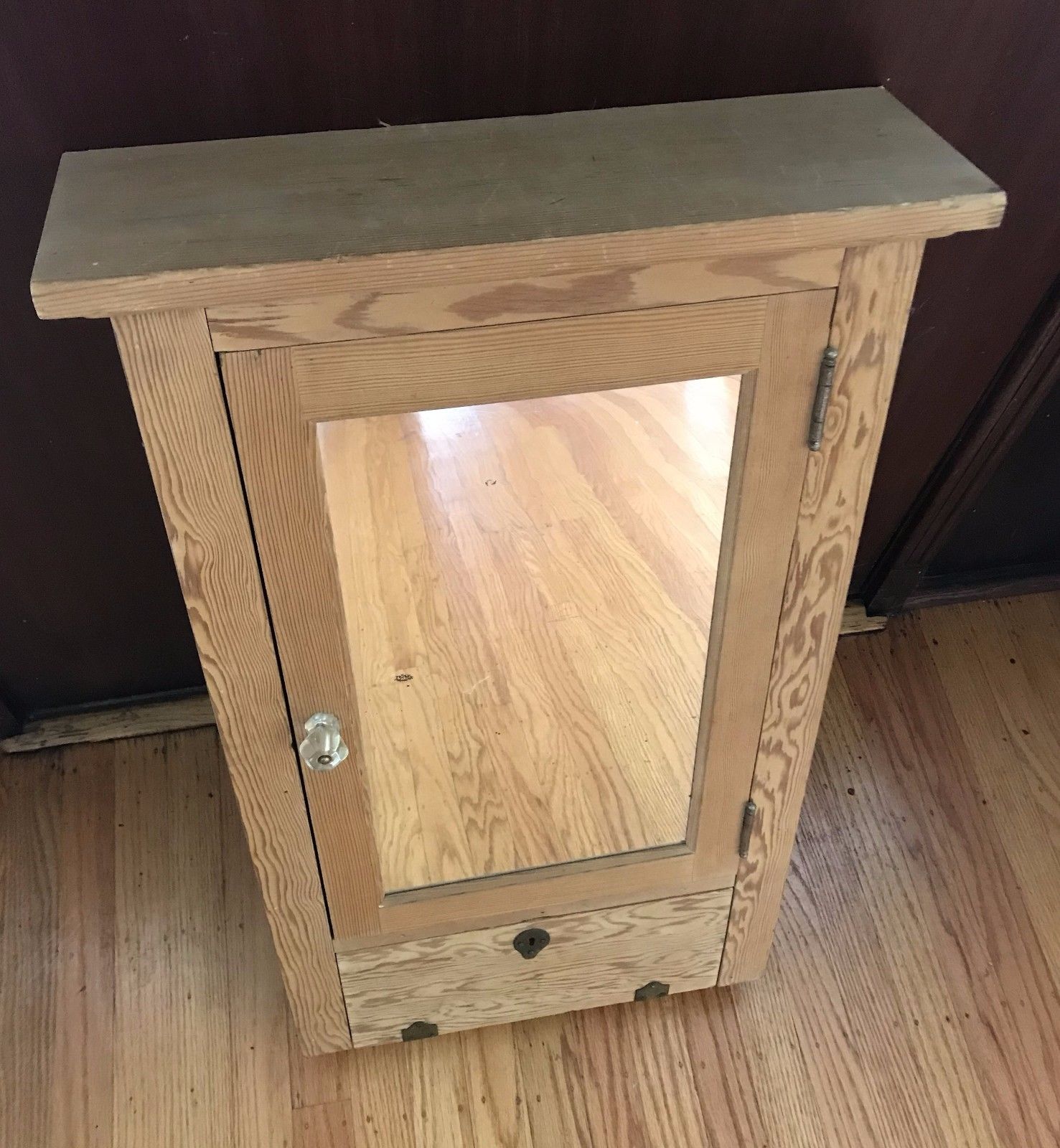 Antique vtg Fir surface mount wall medicine cabinet mirror locking compartment