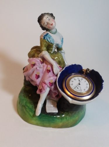 Title (ebay affiliate link): Magnificent Antique Porcelain Figural Pocket Watch Holder Lady at Shell Fou tain