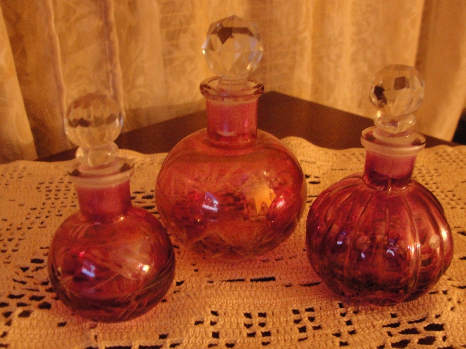 Title (ebay affiliate link): Set of 3 Vintage Purple cut glass perfume bottle bottles clear glass toppers