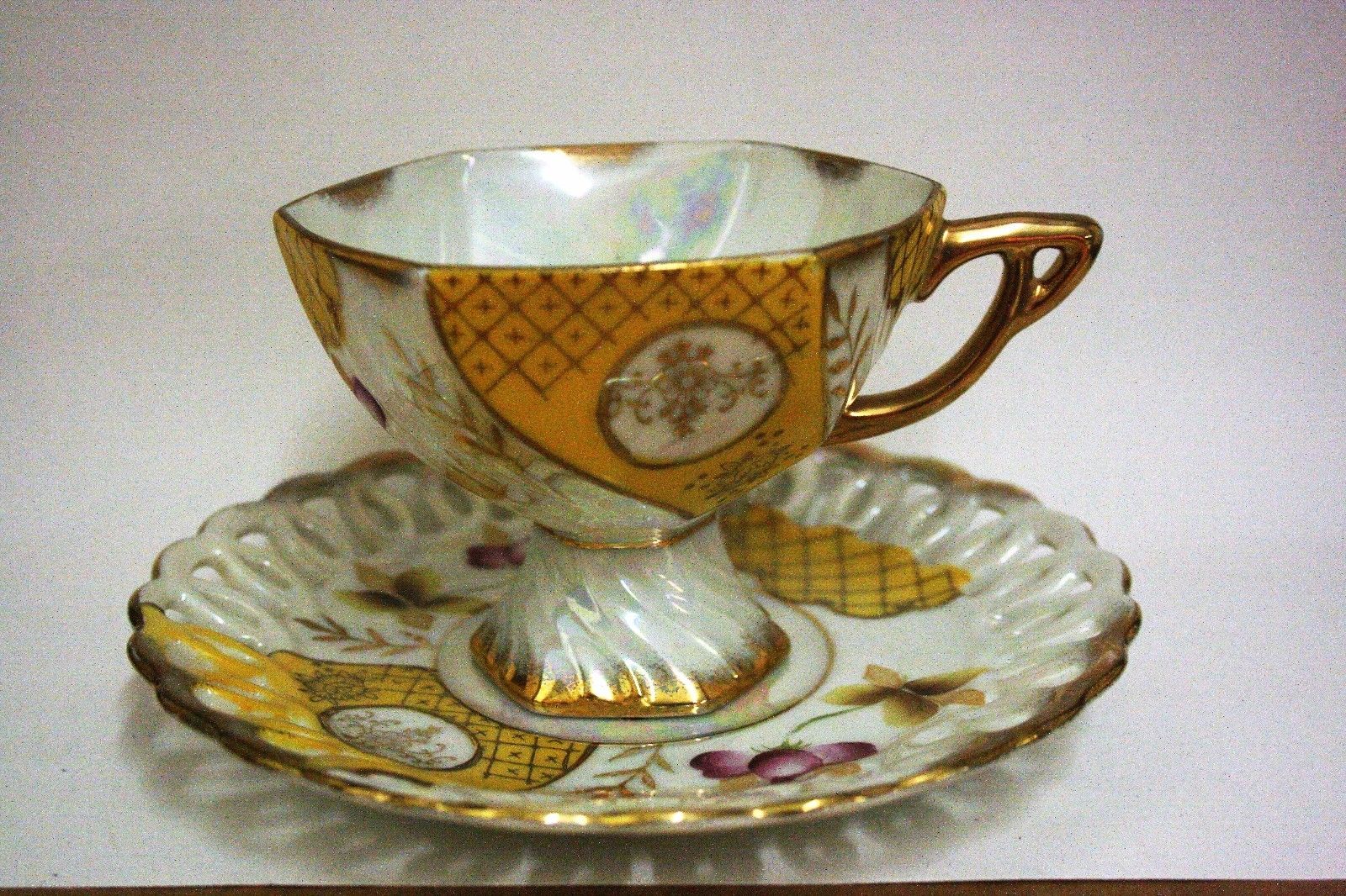 Vintage Vcagco Porcelain Floral Cup & Saucer, Lattice, Gold Trim