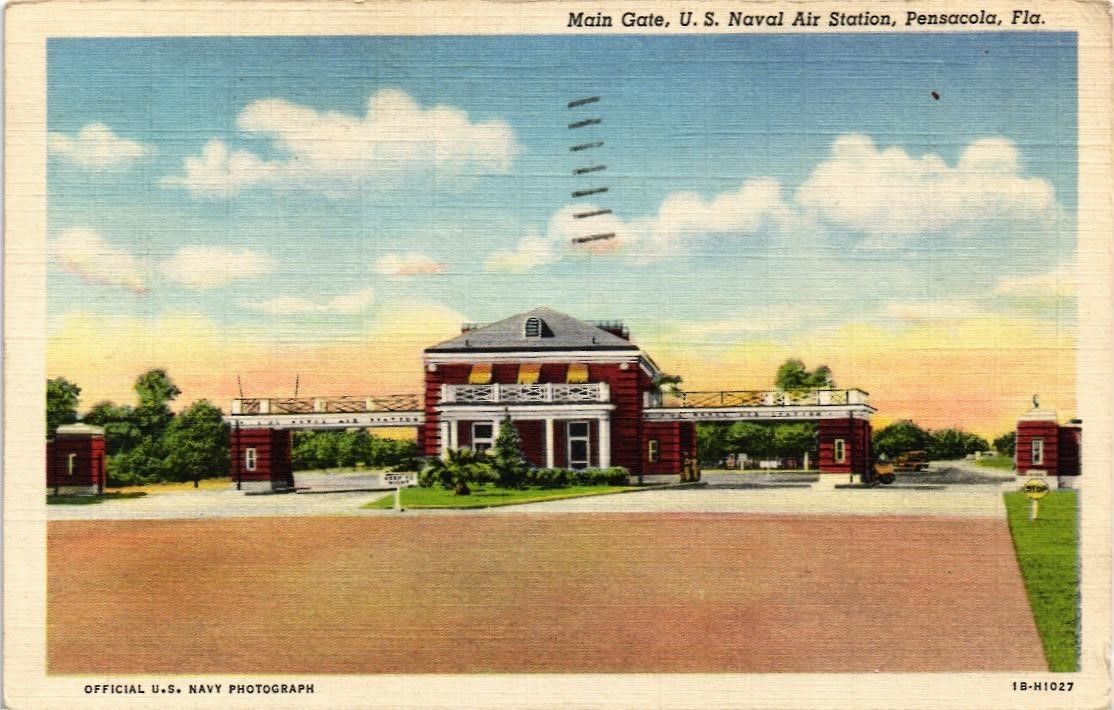 DR JIM STAMPS US MAIN GATE NAVAL AIR STATION PENSACOLA LINEN COLORTONE POSTCARD