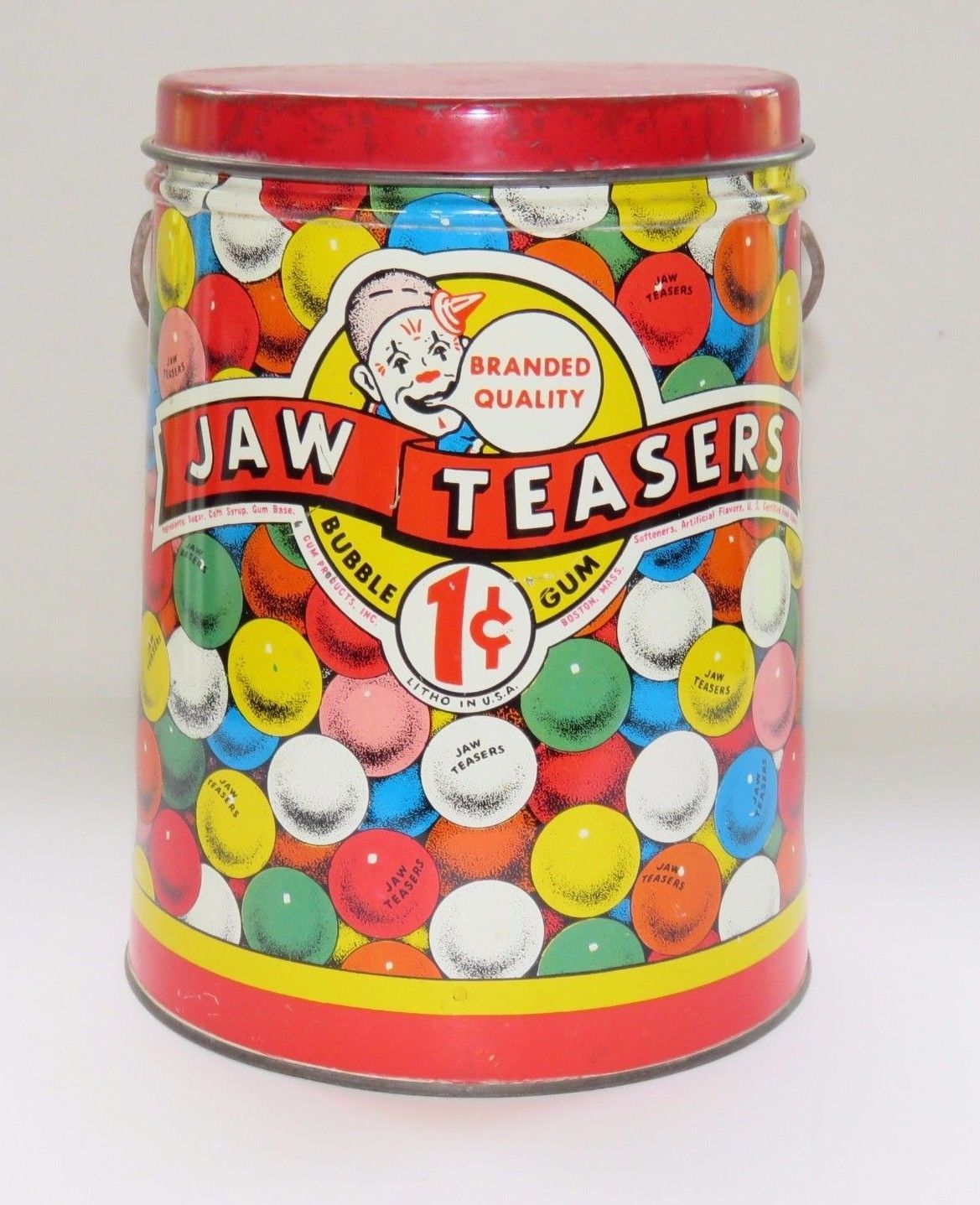 Title (ebay affiliate link): Vintage Jaw Teasers One Cent Bubble Gum Tin Litho Store Display Pail