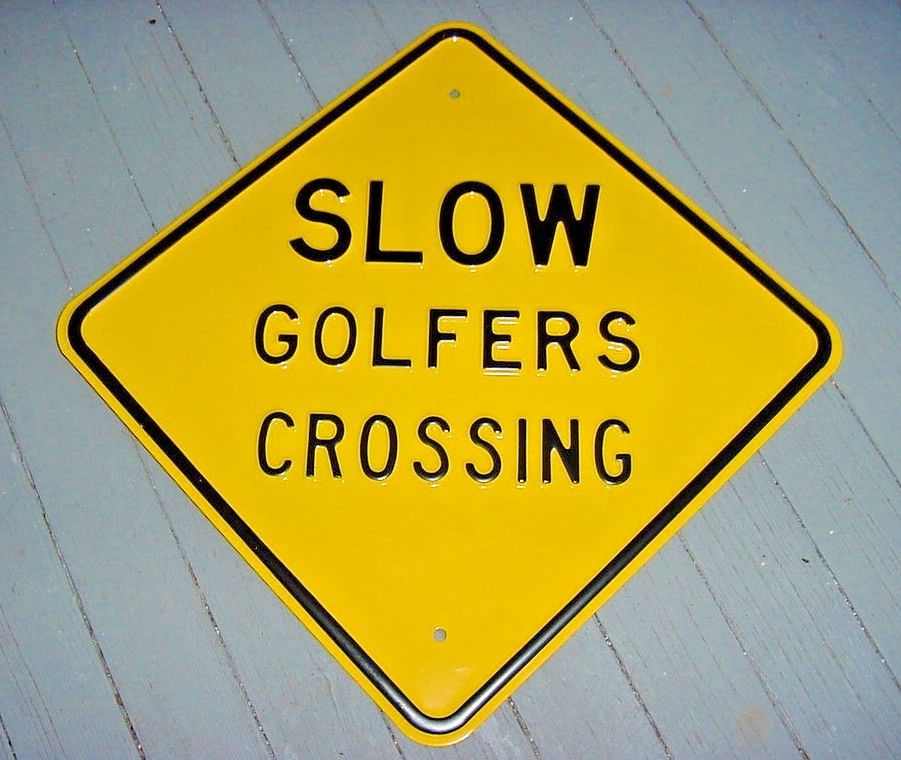 Title (ebay affiliate link): NEAR MINT 1960s vintage SLOW GOLFERS CROSSING Old Embossed Steel Golf Road Sign