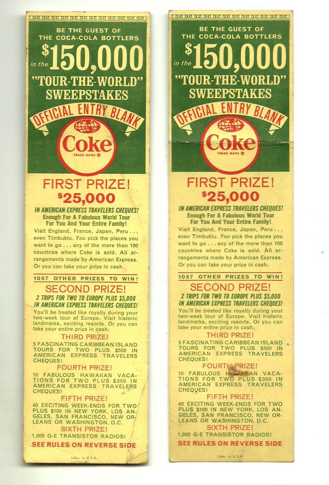 Vintage Lot of 2 1962 Tour the World Coca-Cola Sweepstakes Forms Bottle Cap Game