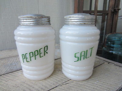 Title (ebay affiliate link): VINTAGE Ribbed White MILK GLASS Green Letters Range SALT & PEPPER SHAKERS Set
