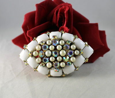 Title (ebay affiliate link): Vintage Milk Glass AB Rhinestone Faux Pearl Pin Brooch CAT RESCUE