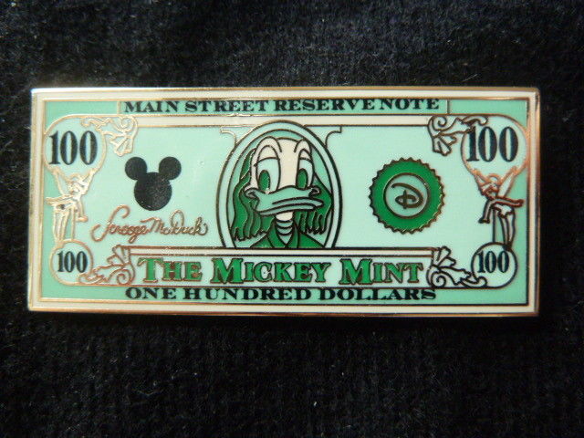 Title (ebay affiliate link): Disney Pin 61032 Mickey Mint $100 Dollar Bill Donald Duck One Hundred Dollars
