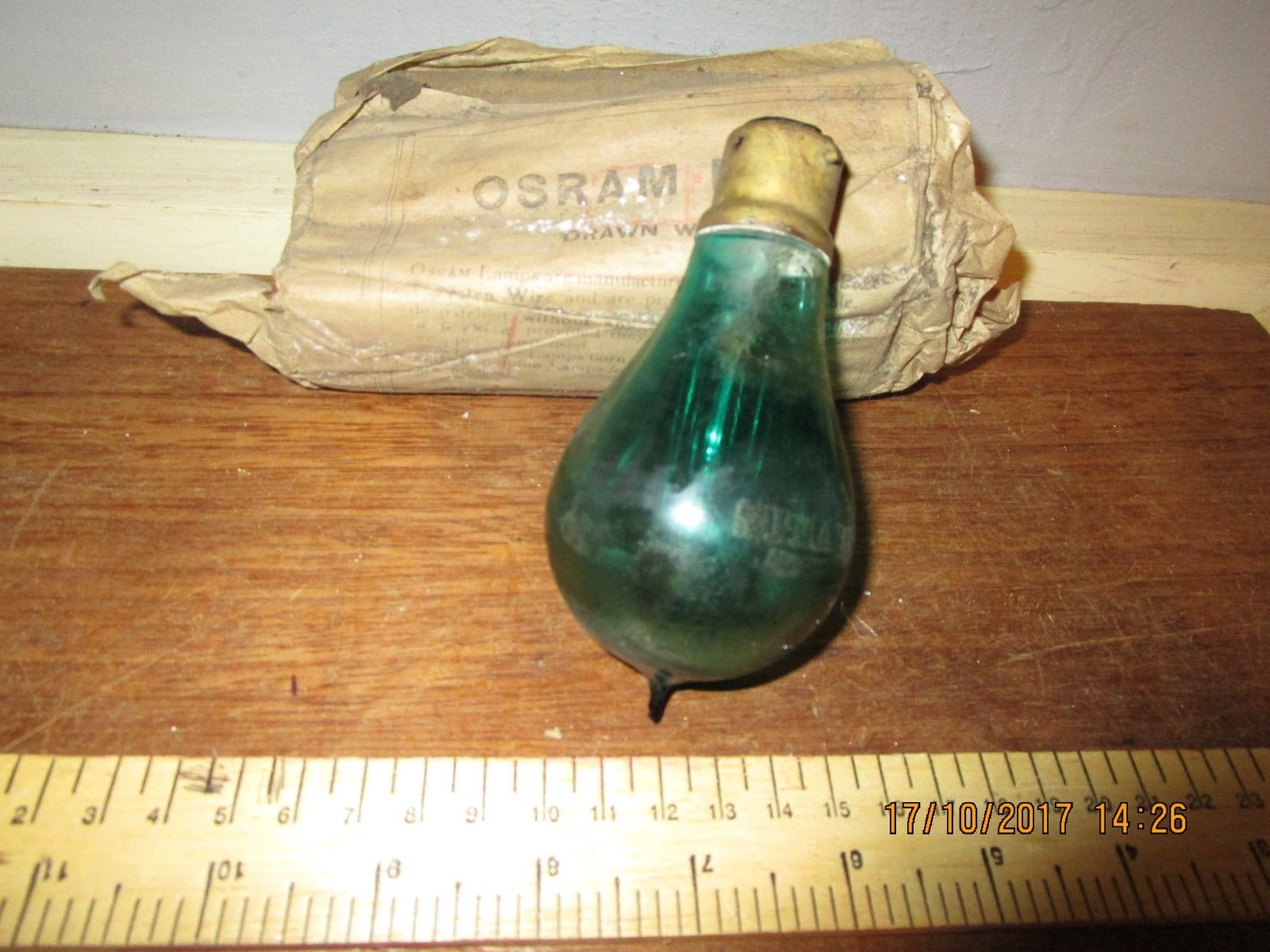 Title (ebay affiliate link): Early 20th C. / Edwardian / WW1 era Osram drawn wire lamp bulb in packet - green