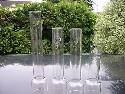 LOT OF FOUR SPARE GLASS CHIMNEYS, OLD STOCK, FIT 14 LINE KOSMOS OIL LAMP BURNERS