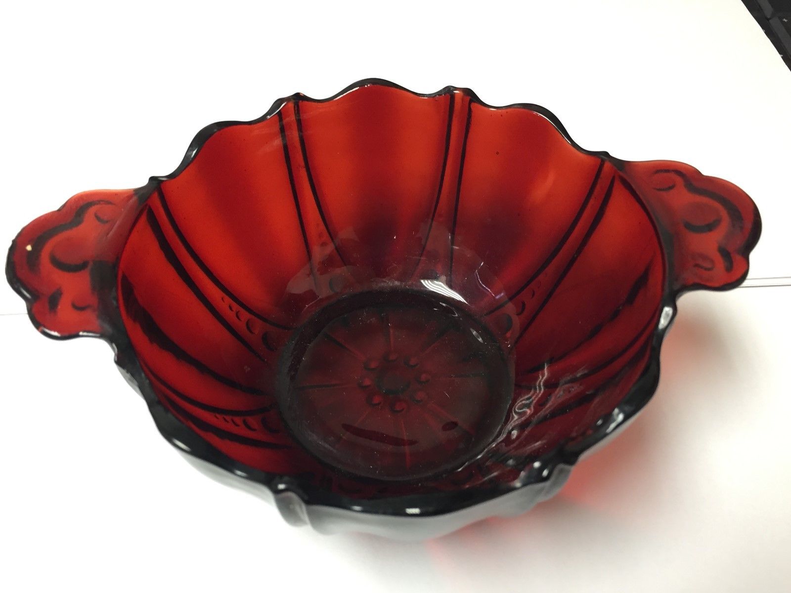 Title (ebay affiliate link): Beautiful Oyster & Pearl Ruby Red Depression Glass Bowl/Candy Dish with Handles