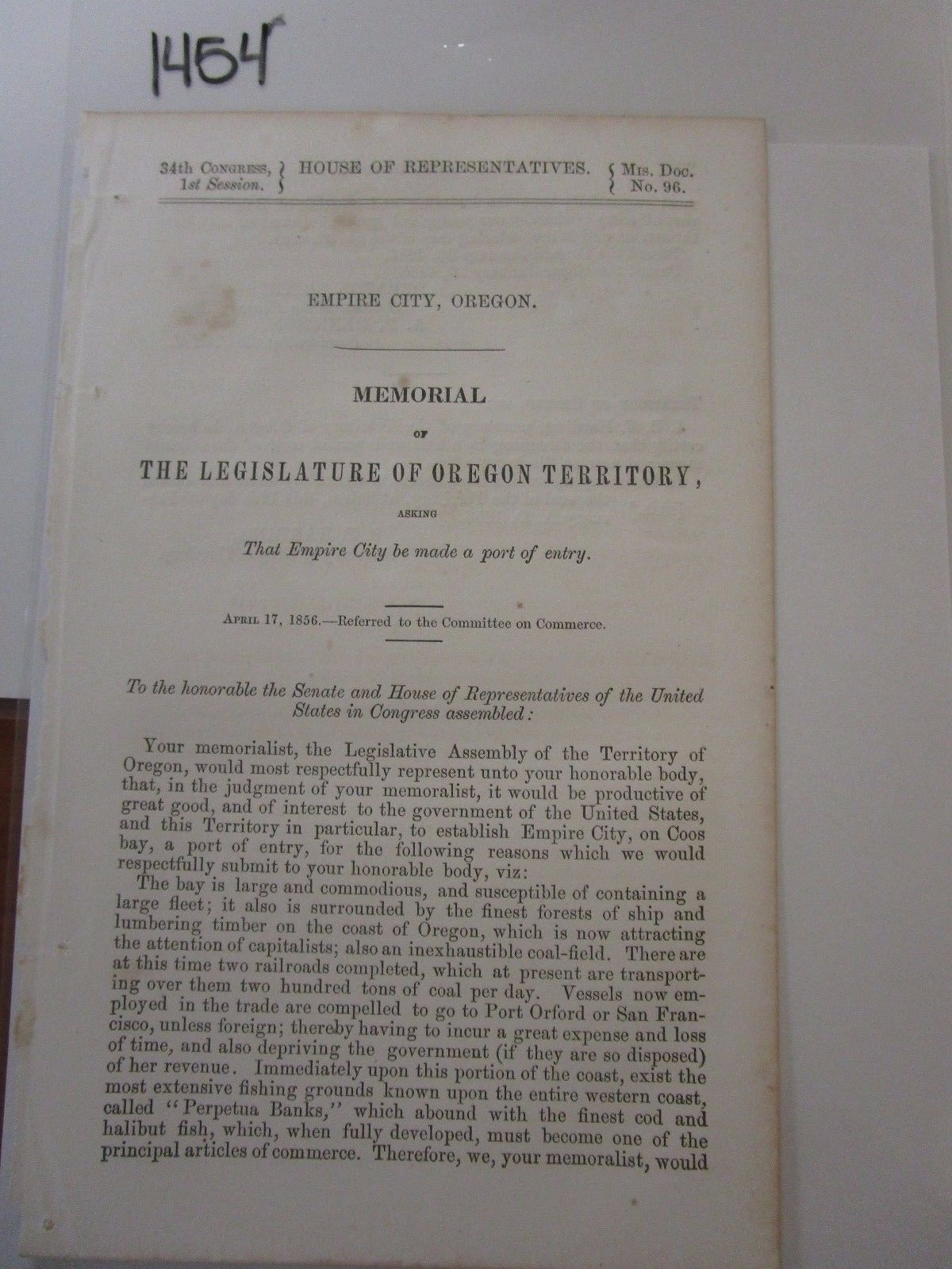 Government Report 1856 Empire City, Oregon, Oregon Territory #1454