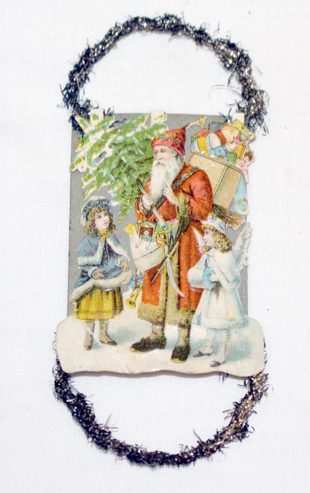 Title (ebay affiliate link): Santa & Snow Angel, greeting Victorian Girl. Presents Galore. Paper & Tinsel Orn