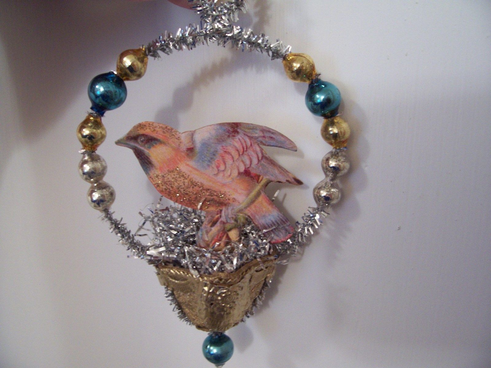 Antique Look Christmas Ornament, Small BIRD/Basket,Scrap,Tinsel,Glass, Handmade