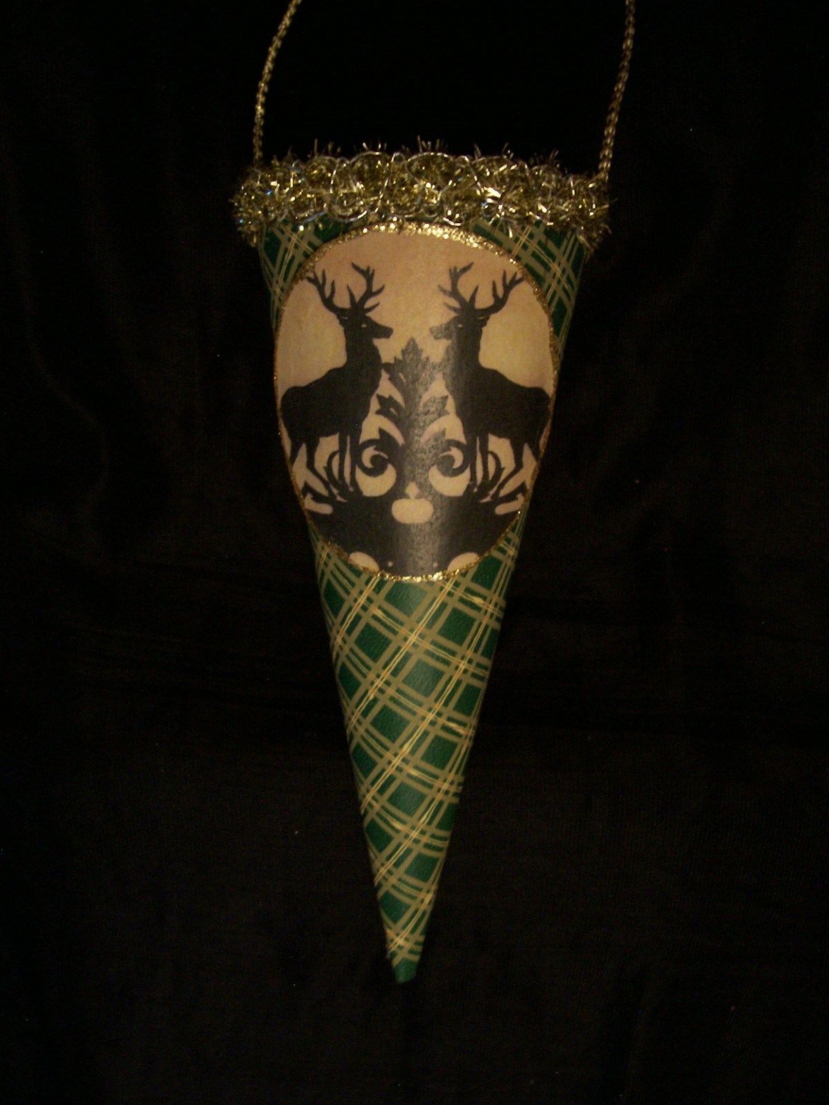 Antique/Vtg.Look Christmas Ornament, Cone, DEER/STAGS, Scrap,Tinsel, Handmade