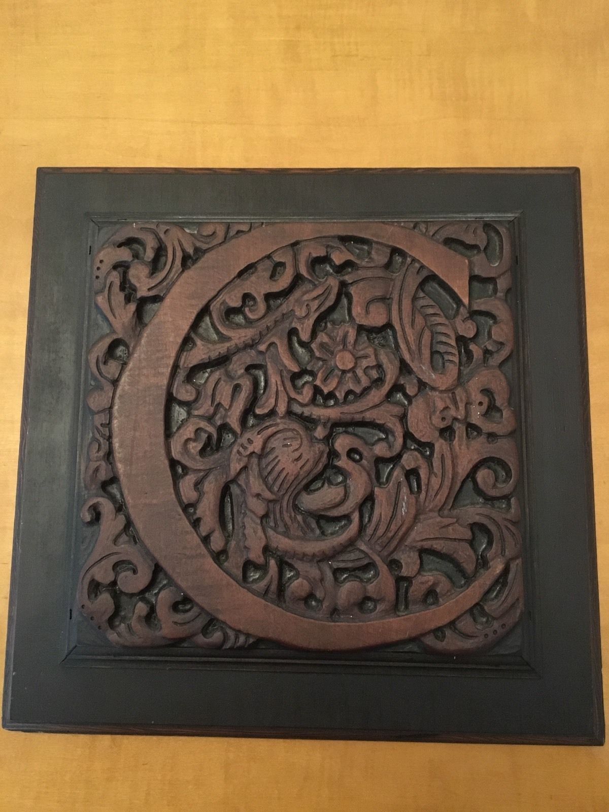 ANTIQUE HAND CARVED WOODEN PANEL - 14X14 - INITIAL "C"
