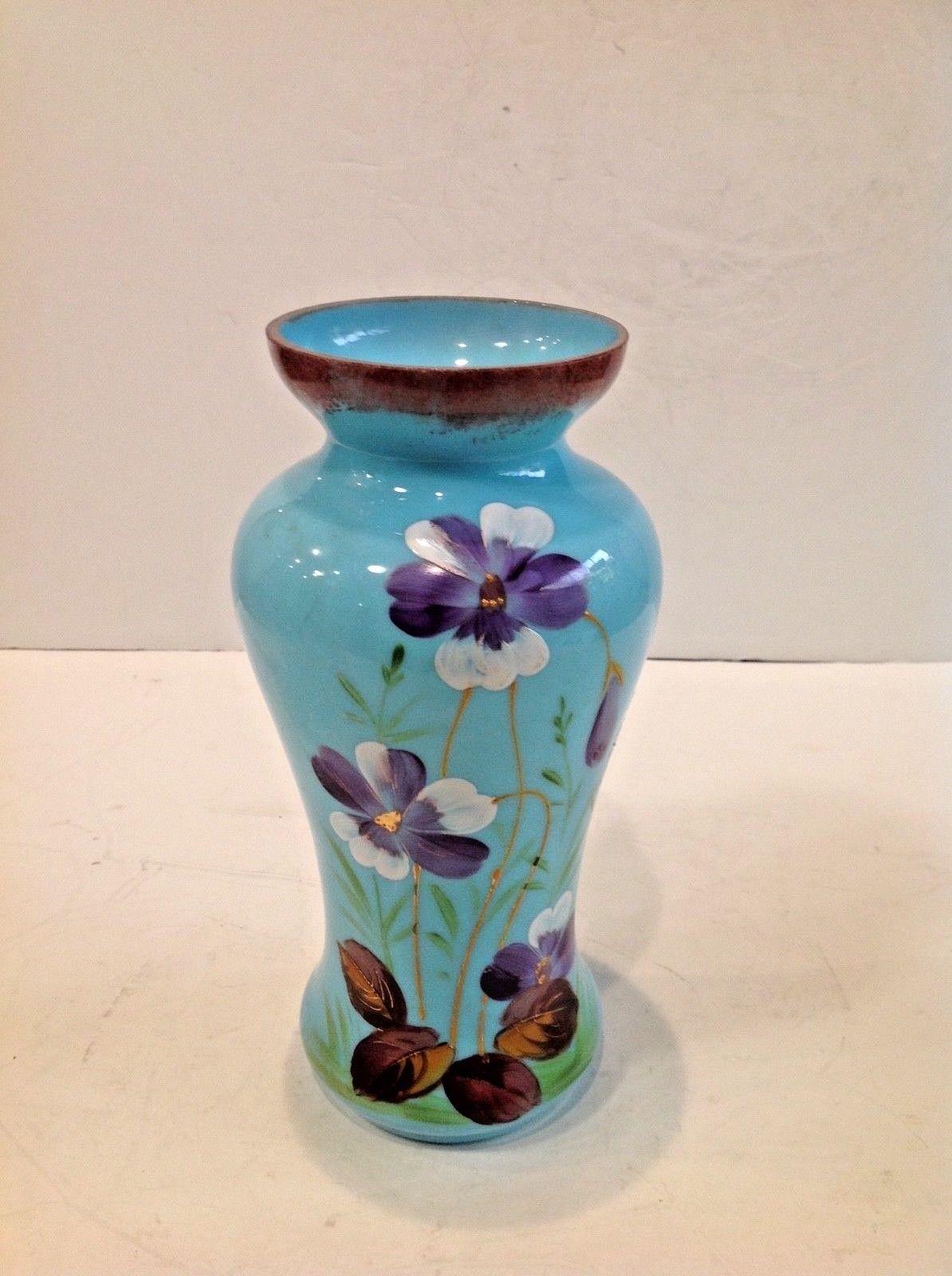 Title (ebay affiliate link): Vintage Bristol Robins Egg Blue 8 1/2" Tall Vase with Enameled Flowers
