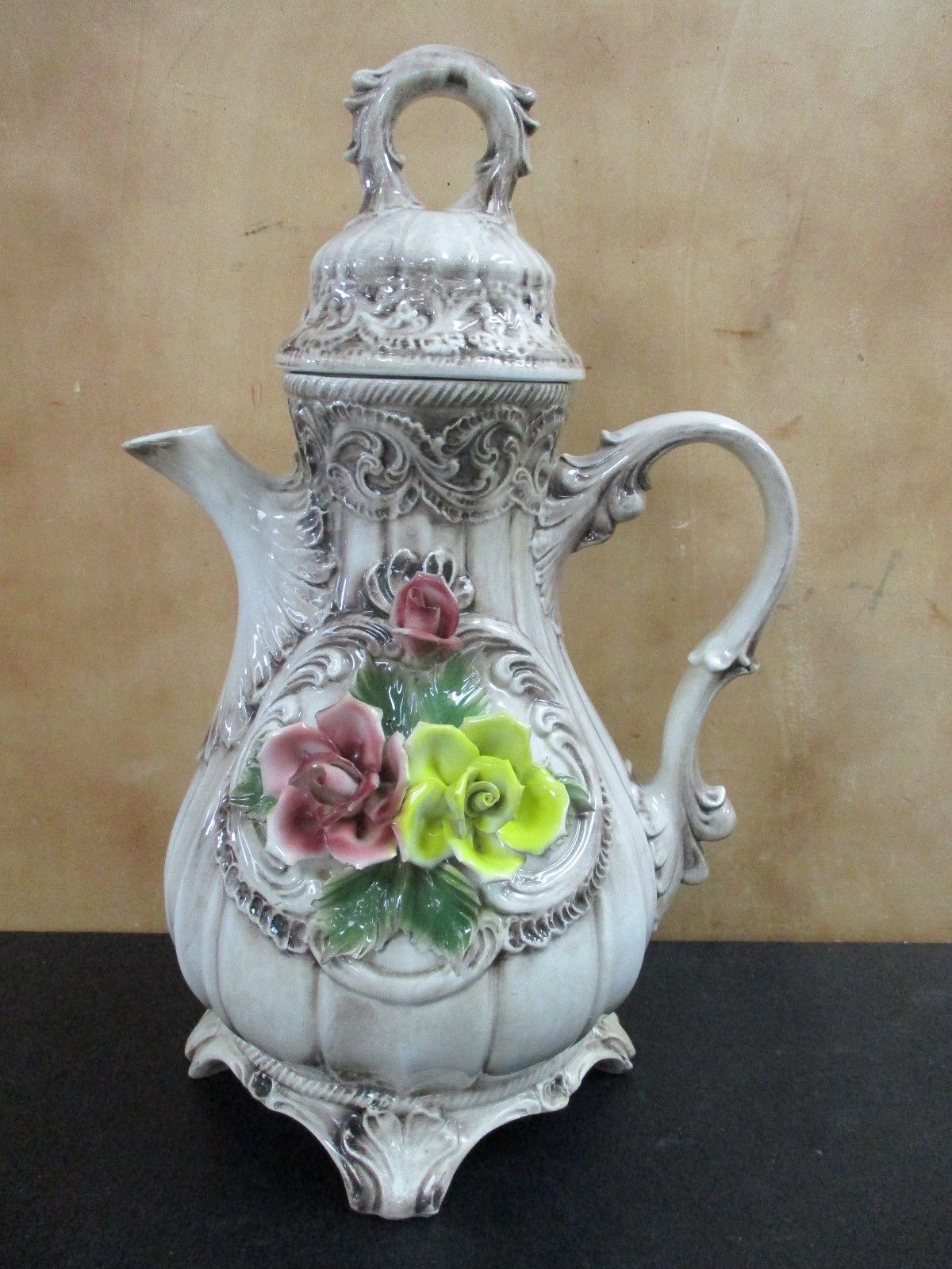 Title (ebay affiliate link): VINTAGE STUNNING CAPODIMONTE PITCHER & LID 22"HT DECORATIVE ROSE FLOWER ITALY