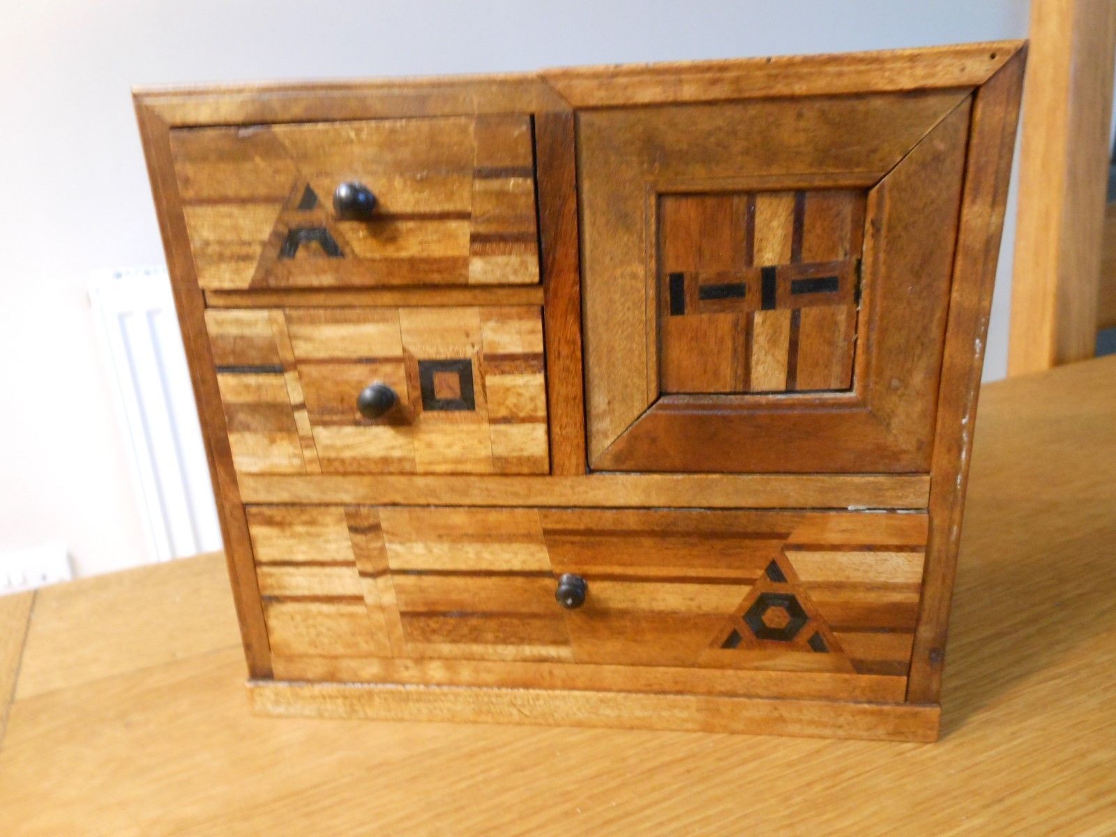 Title (ebay affiliate link): Antique Apprentice piece Small Inlaid Wooden Chest of Drawers
