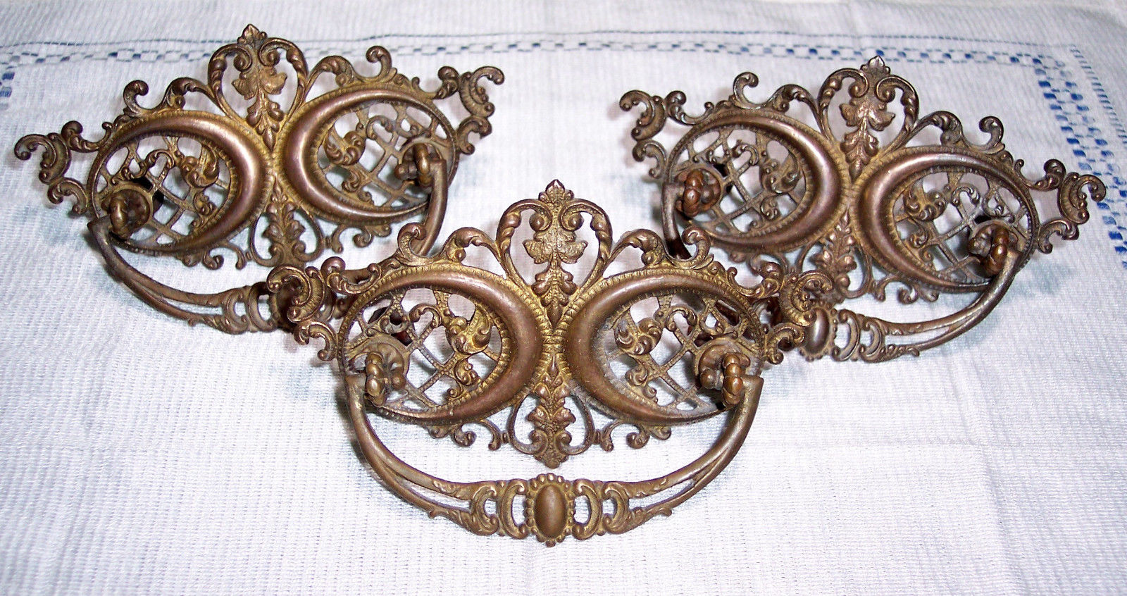 Title (ebay affiliate link): 3 Antique Victorian Fancy Scroll & Lattice Brass Drawer Handles Furniture Pulls