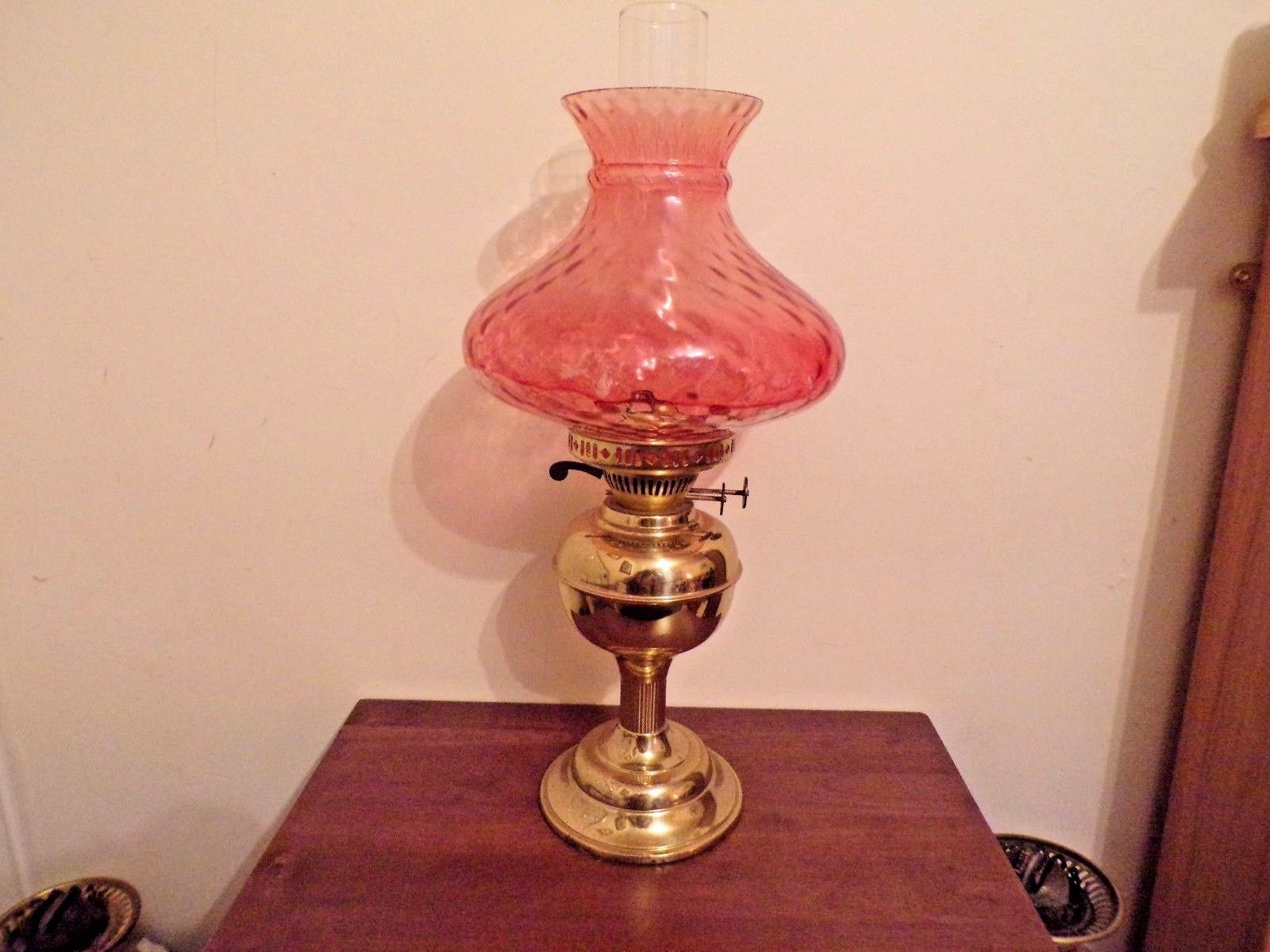 Title (ebay affiliate link): Vintage brass Duplex oil lamp twin burner with snuffer pink glass shade working