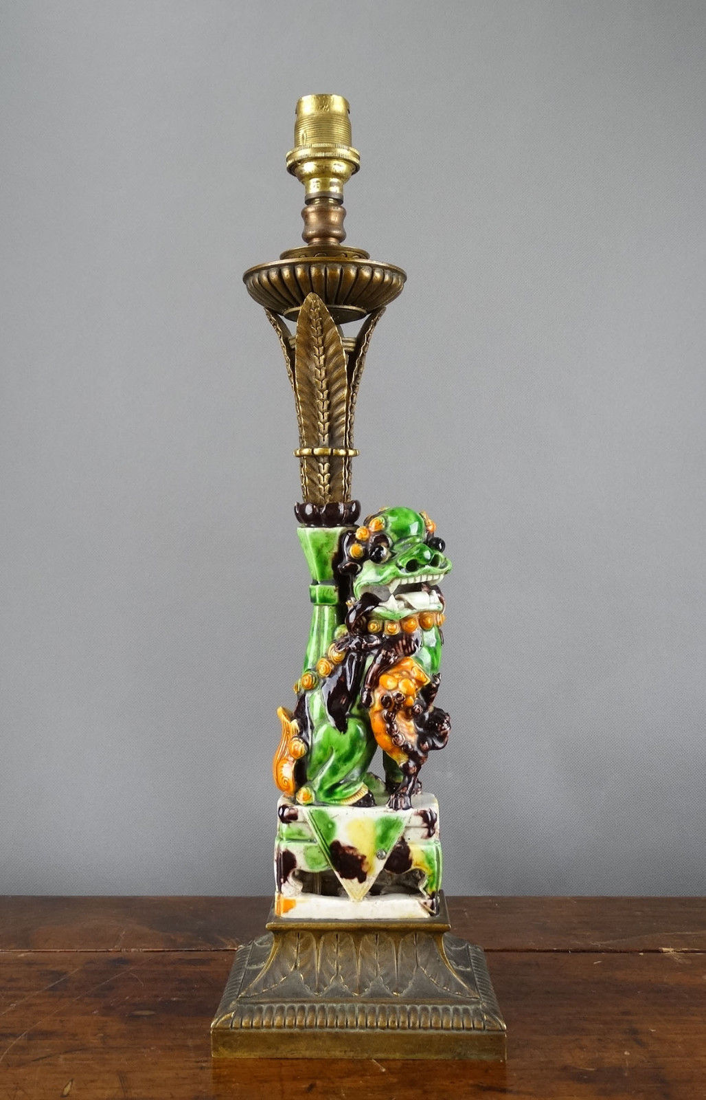 Chinese Foo Dog Statue Incense Holder Lamp Bronze Mount Antique Sancai Porcelain