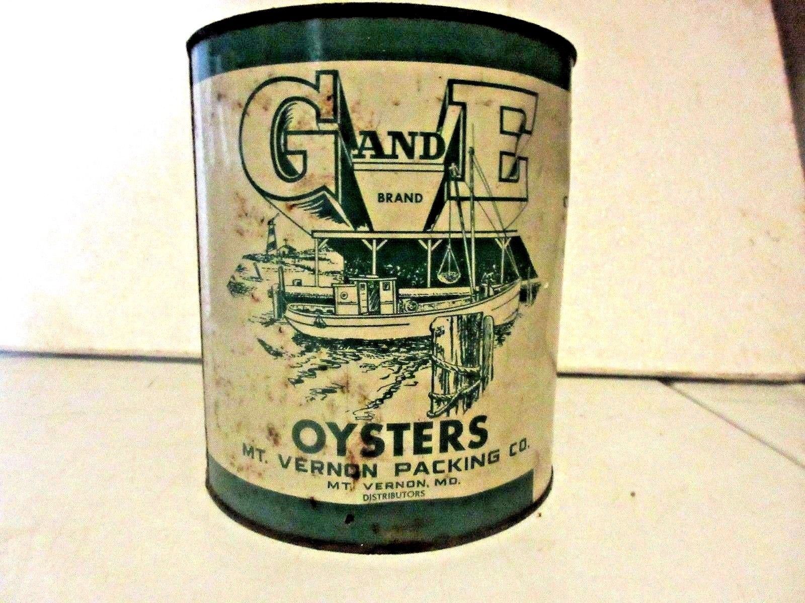 Title (ebay affiliate link): ANTIQUE G AND E OYSTER TIN LITHO CAN VINTAGE MT.VERNON MD OLD SEA FOOD LIGHTHOUS
