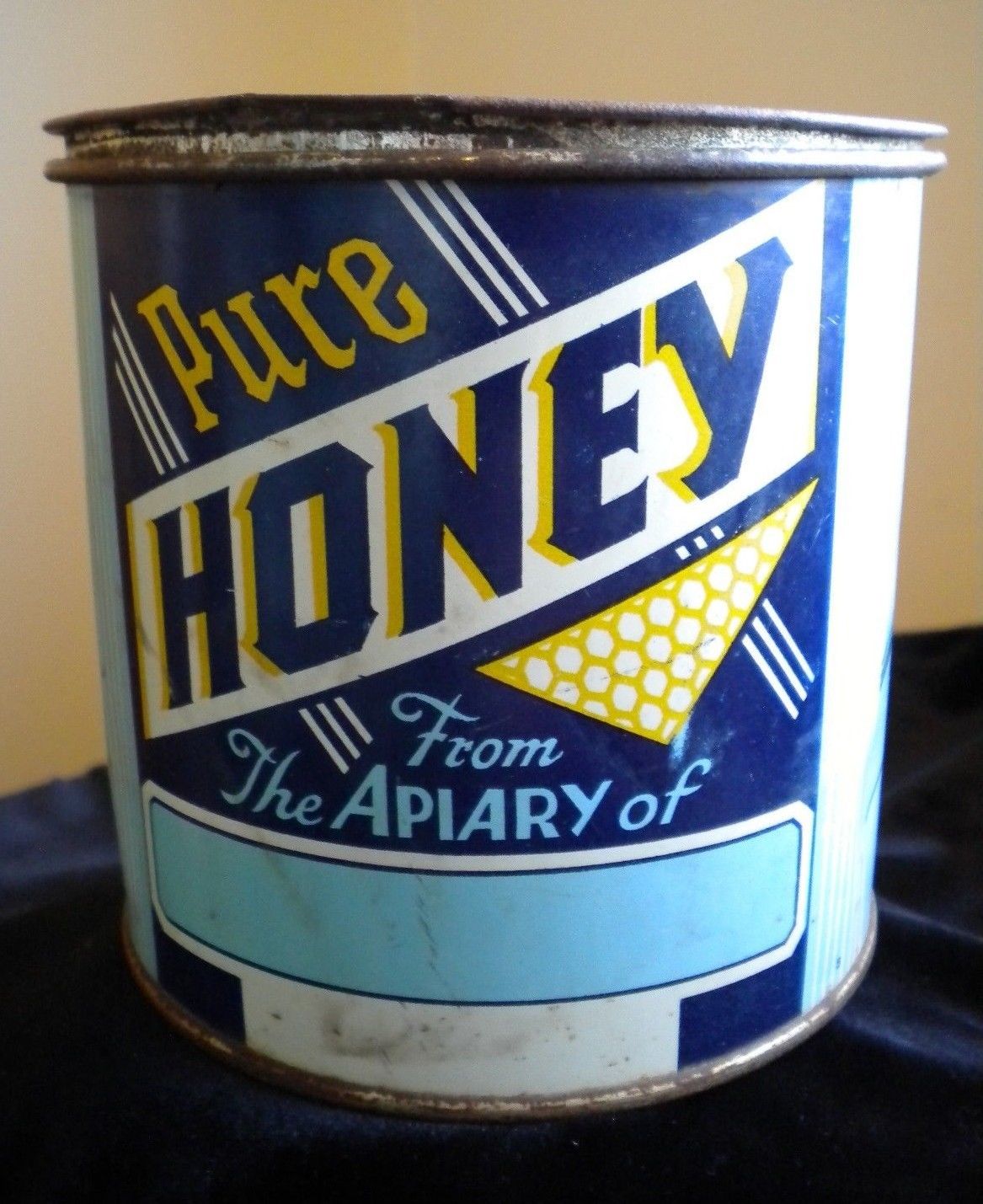 Title (ebay affiliate link): Vtg. HONEY TIN - 2 LB. 3 OZ. CAN - PURE HONEY - ART DECO- RUSTIC -FRENCH WRITING