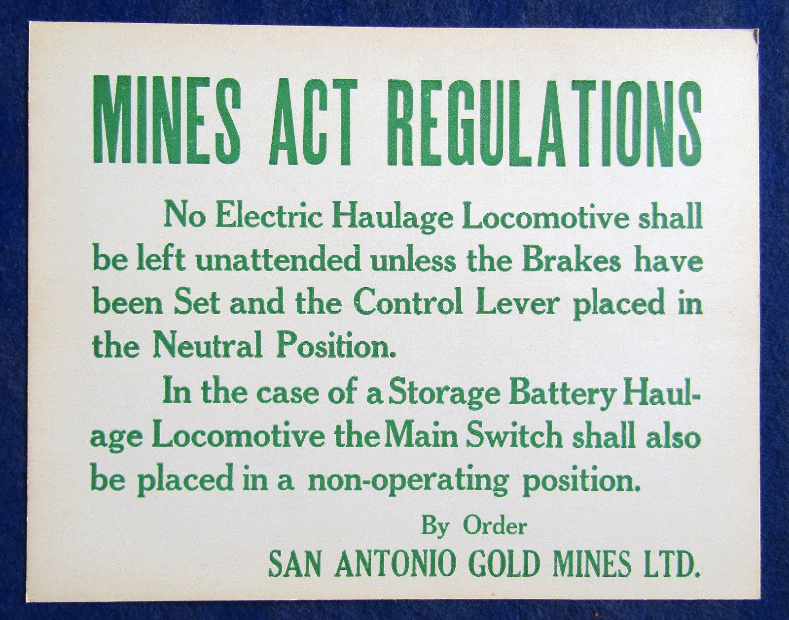 Vintage San Antonio Gold Mine Cardboard Mines Act Sign - Locomotives