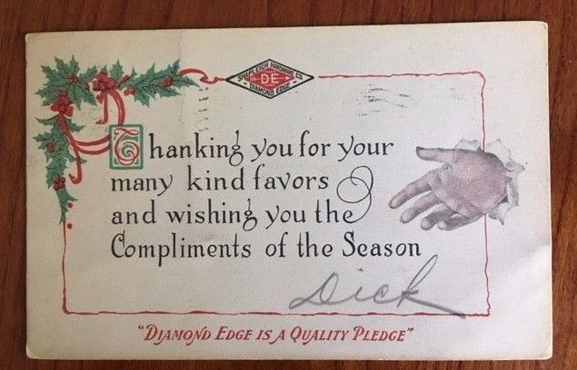 Title (ebay affiliate link): Shapleigh Hardware Co. Advertising Holiday Greeting Postcard c. 1913