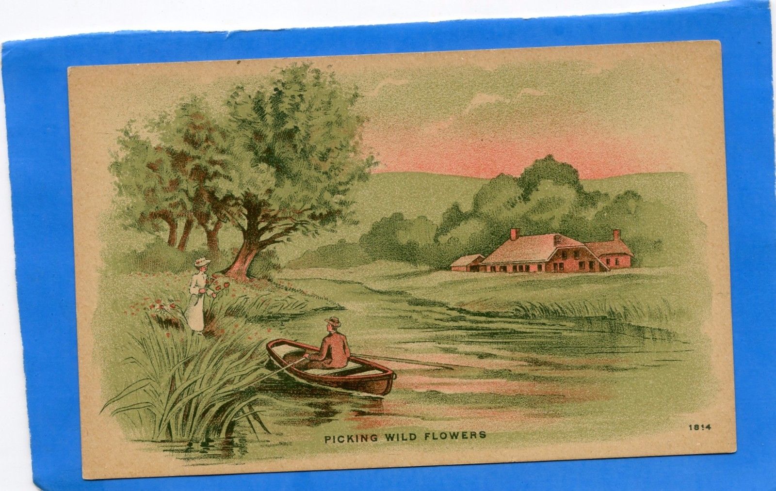 vintage 1910''s greeting postcard, "Picking Wild Flowers", couple, boat, home etc