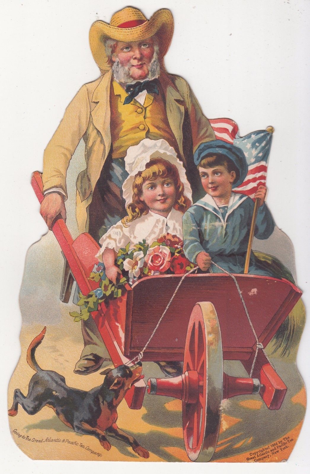Title (ebay affiliate link): Great Atlantic Pacific Tea Company Patriotic Flag Wheelbarrow Dog Diecut c1880s