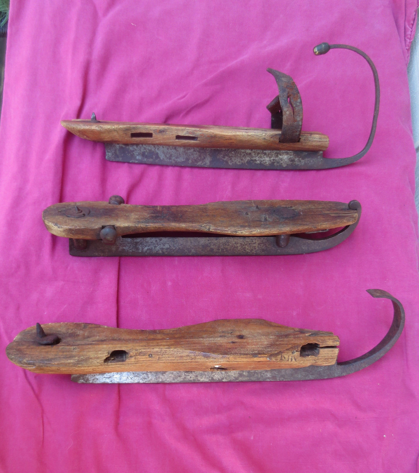 Early Antique LOT of 3 Ice Skates Wooden Iron 2 Large Curl- 1 PAT. 1856-57 AAFA