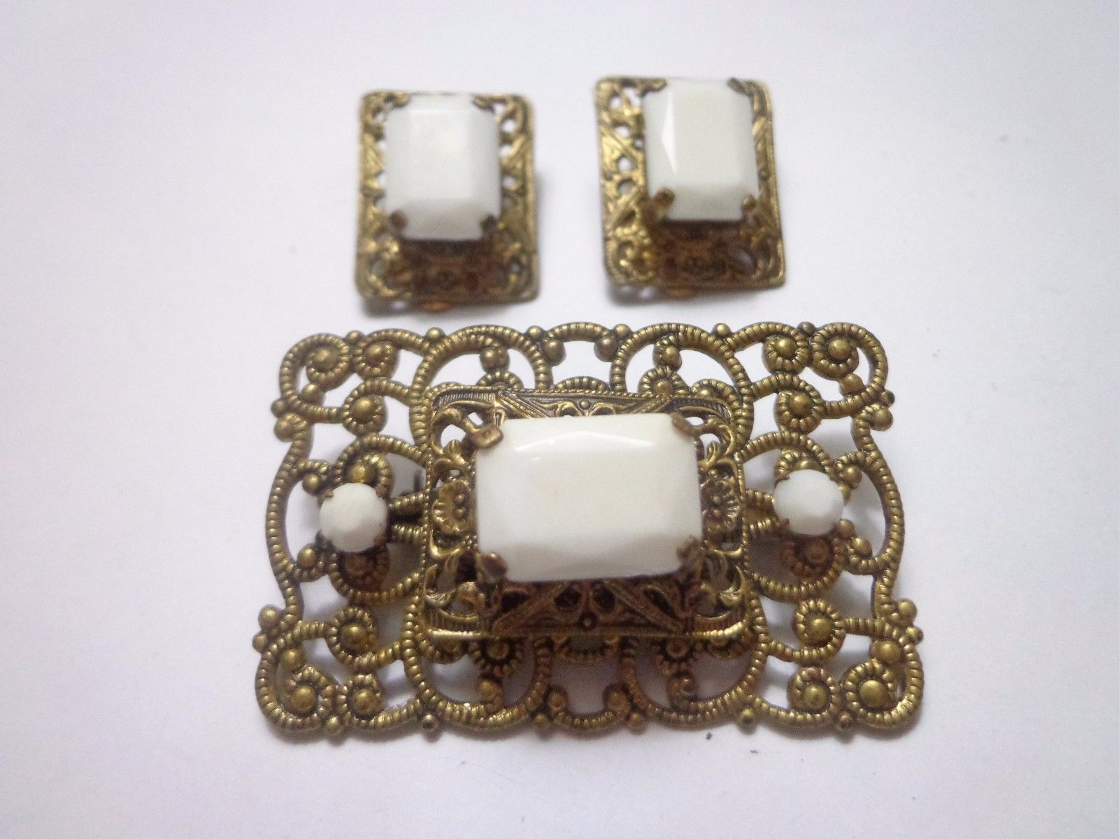 Title (ebay affiliate link): VTG WHITE MILK GLASS VICTORIAN REVIVAL FILIGREE BROOCH EARRING SET