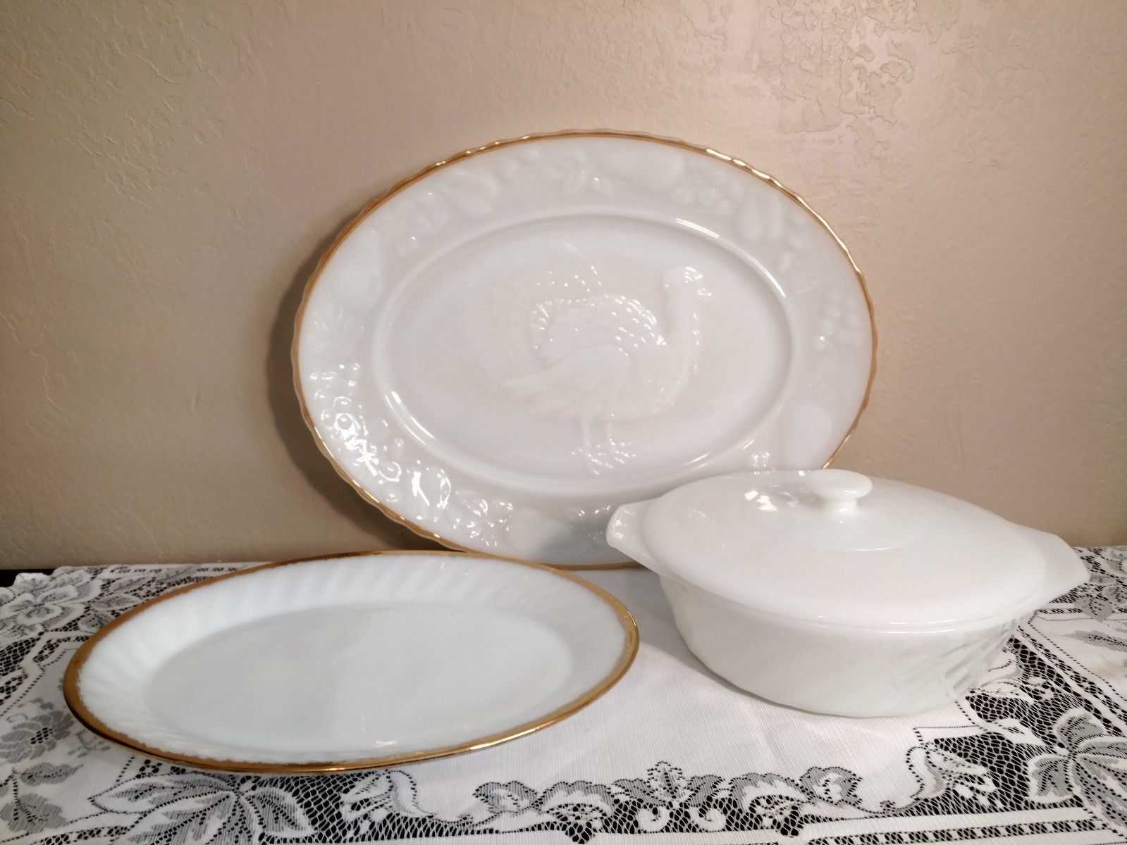 Anchor Hocking & Fire-King Turkey Platter Set - Gold Trim - White Milk Glass