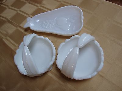 Signed Westmoreland Dogwood Milk Glass 2 Handle Basket Candy Dishes & 1 Plate