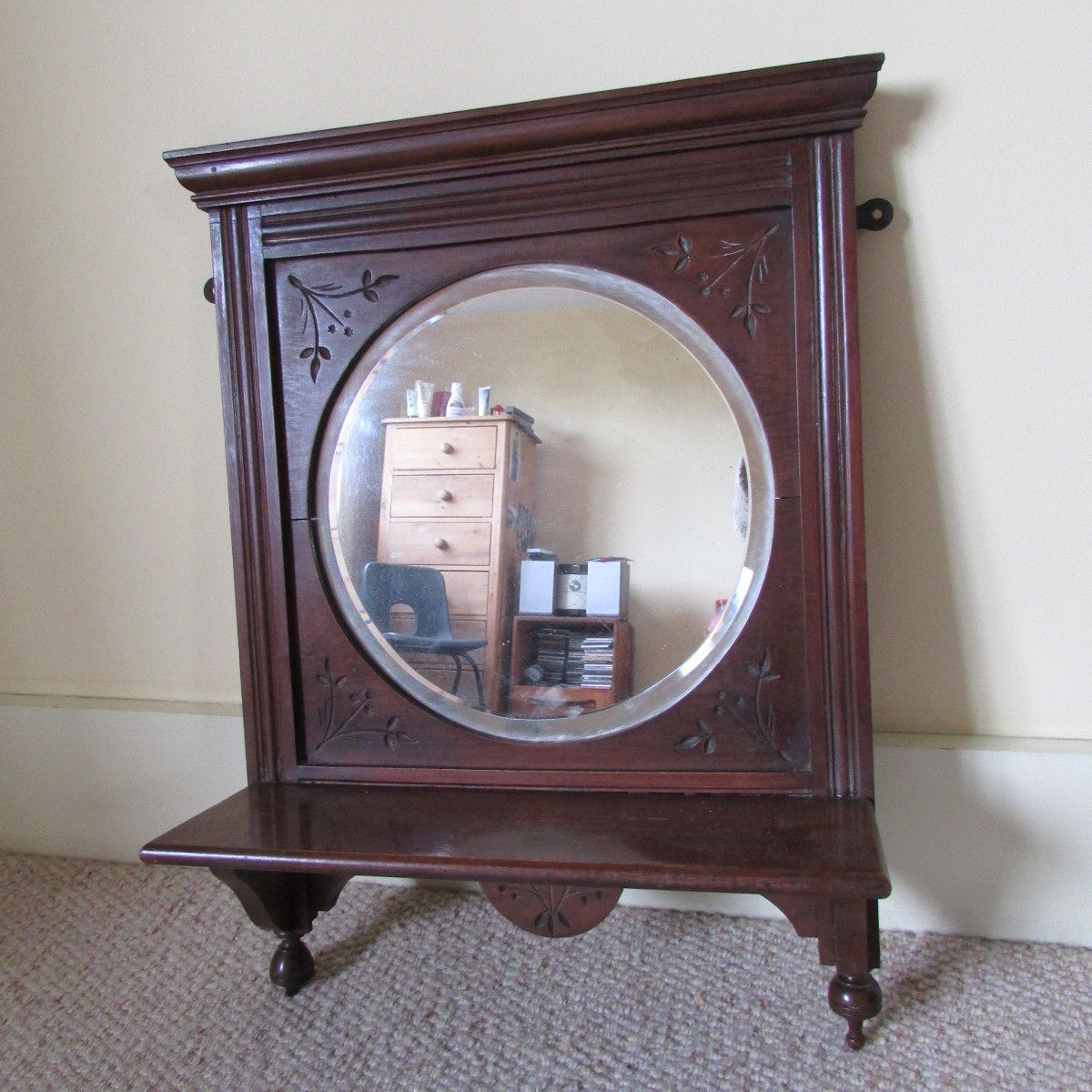 Title (ebay affiliate link): antique decorated wood wall mirror with shelf, circular bevelled glass mirror