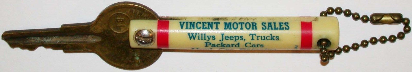 Title (ebay affiliate link): Vintage keychain VINCENT MOTOR SALES Willys Jeeps Trucks Packard Cars Sedalia MO