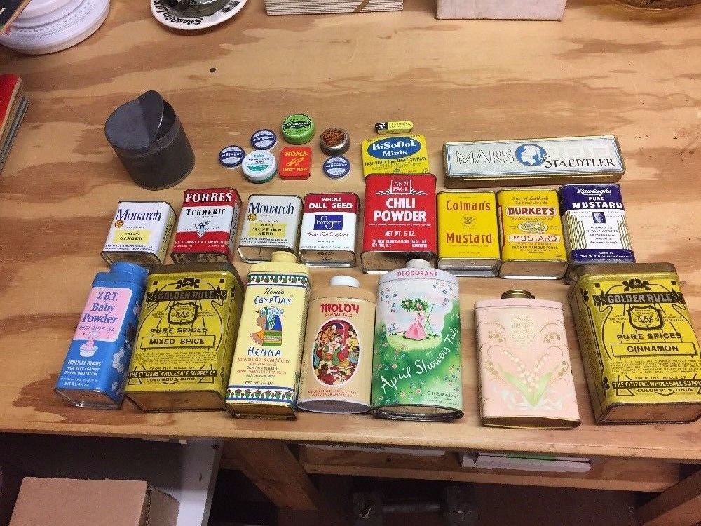 Title (ebay affiliate link): Lot Of 26 Vintage Tins Advertising Medicine Talcum Powder All Shown