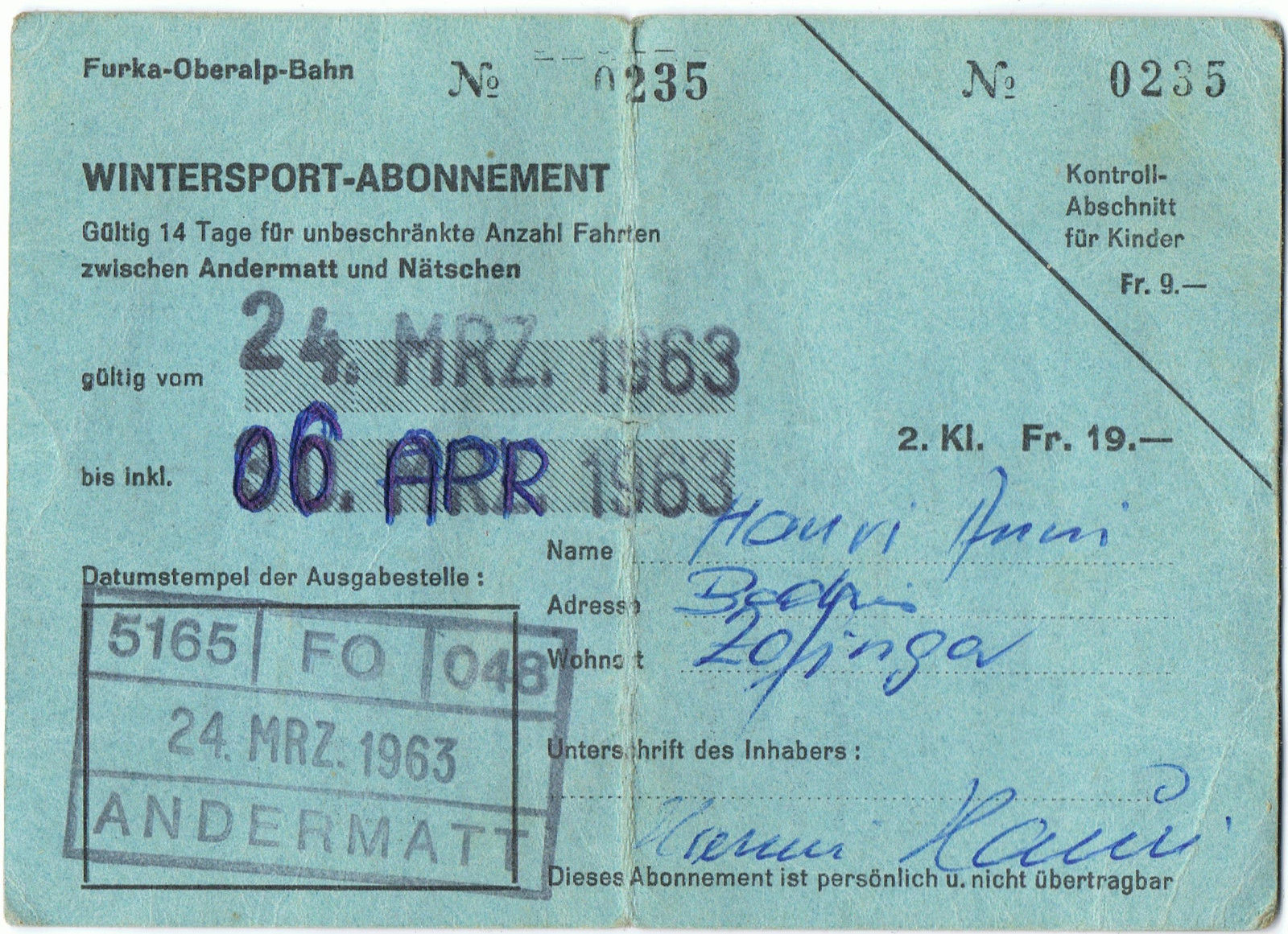 Railway tickets Switzerland Furka-Oberalp Bahn wintersport pass 1963 Andermatt