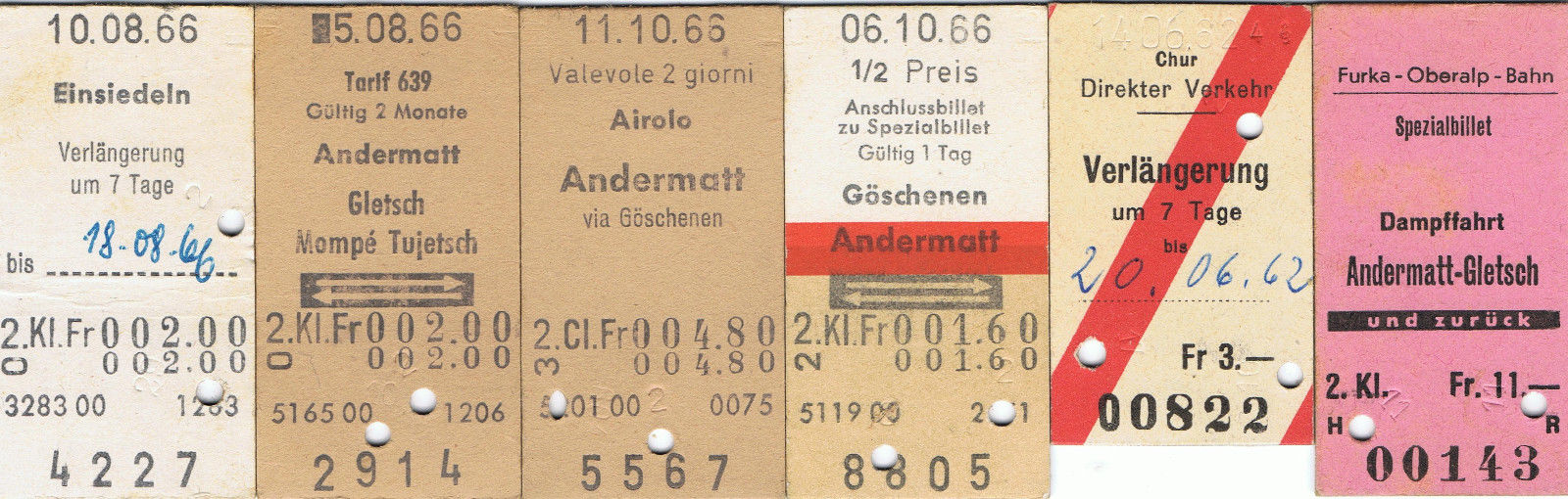Railway tickets Switzerland Furka-Oberalp Bahn various used Edmondsons 1960''s