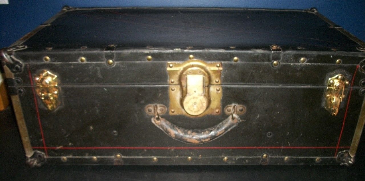 Title (ebay affiliate link): Vintage Metal Travel Trunk Steamer Chest Black with Red Stripe Foot Locker