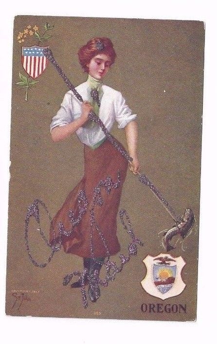 Title (ebay affiliate link): OREGON antique db post card signed St. John "Oregon Maid" Glitter Trim