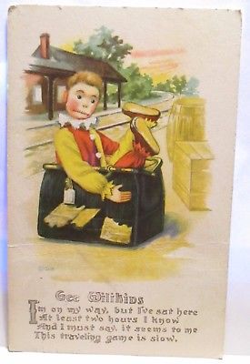 1916 POSTCARD POEM " GEE WILIKINS " IM ON MY WAY BOY DOLL SITS ON SUITCASE