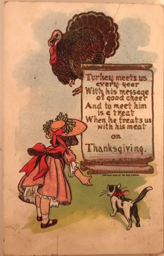 Title (ebay affiliate link): Early 1900s Vintage Thanksgiving Postcard With Girl, Turkey, Cat