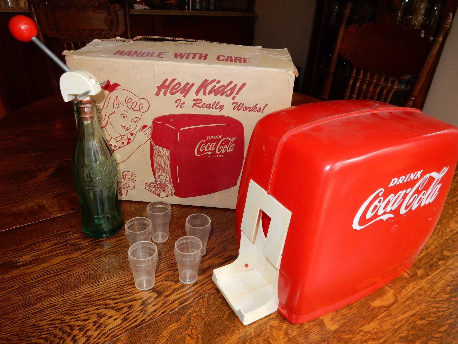 Title (ebay affiliate link): Toy Coca-Cola Dispenser, vintage, w/ 5 Coca-Cola Cups, glass Bottle, and Box