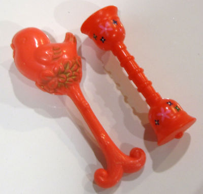 2 Vintage Baby Rattles - Pink Bird Shape & Flowers