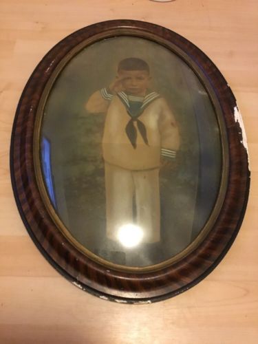Title (ebay affiliate link): Antique Oval Faux Tiger Wood Frame Convex Creepy Naval Boy Dome Bubble Glass