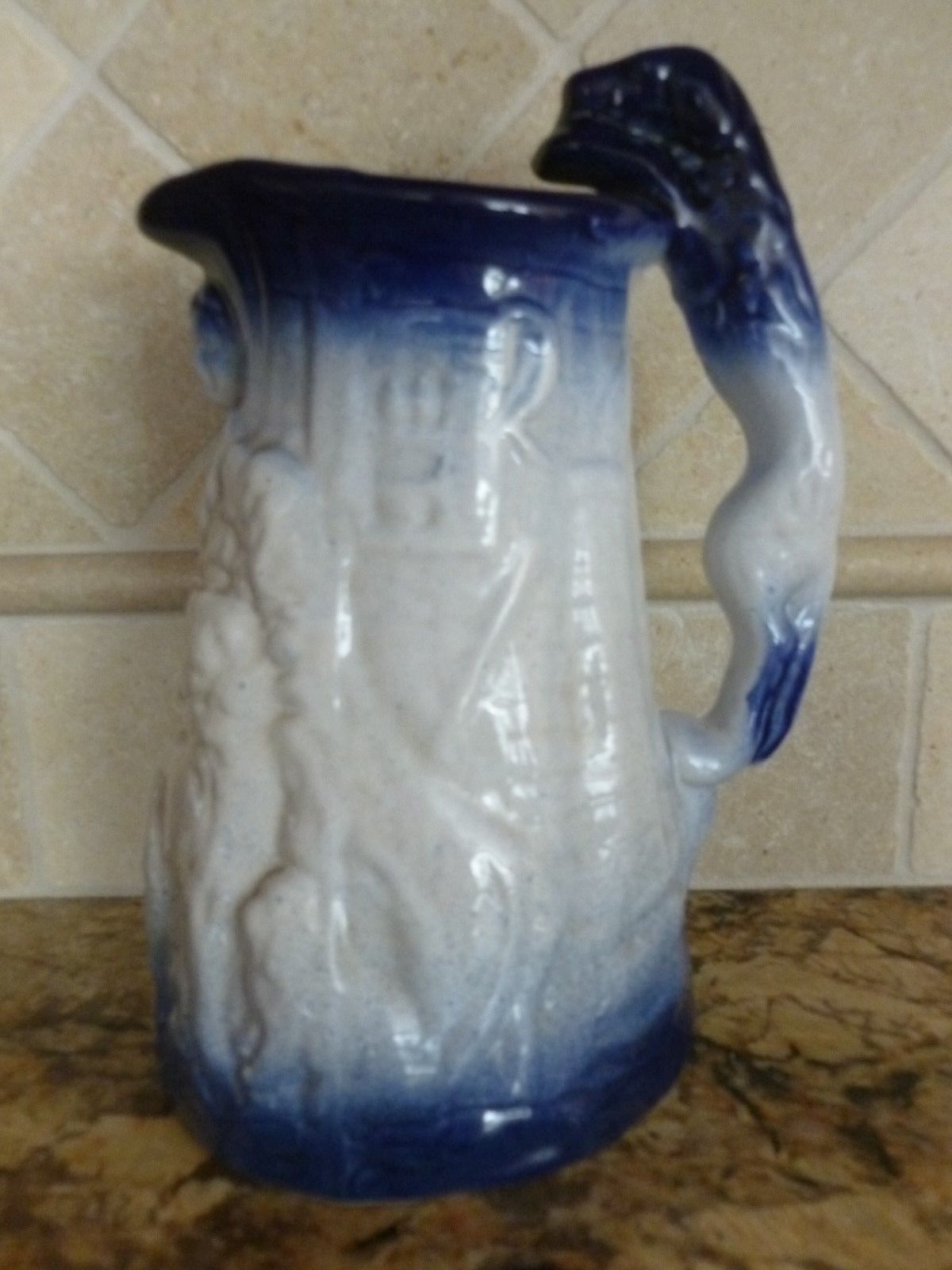 Title (ebay affiliate link): Vintage Blue White Salt Glaze Stoneware Pitcher Dog Handle Woman Reading w/ Dogs