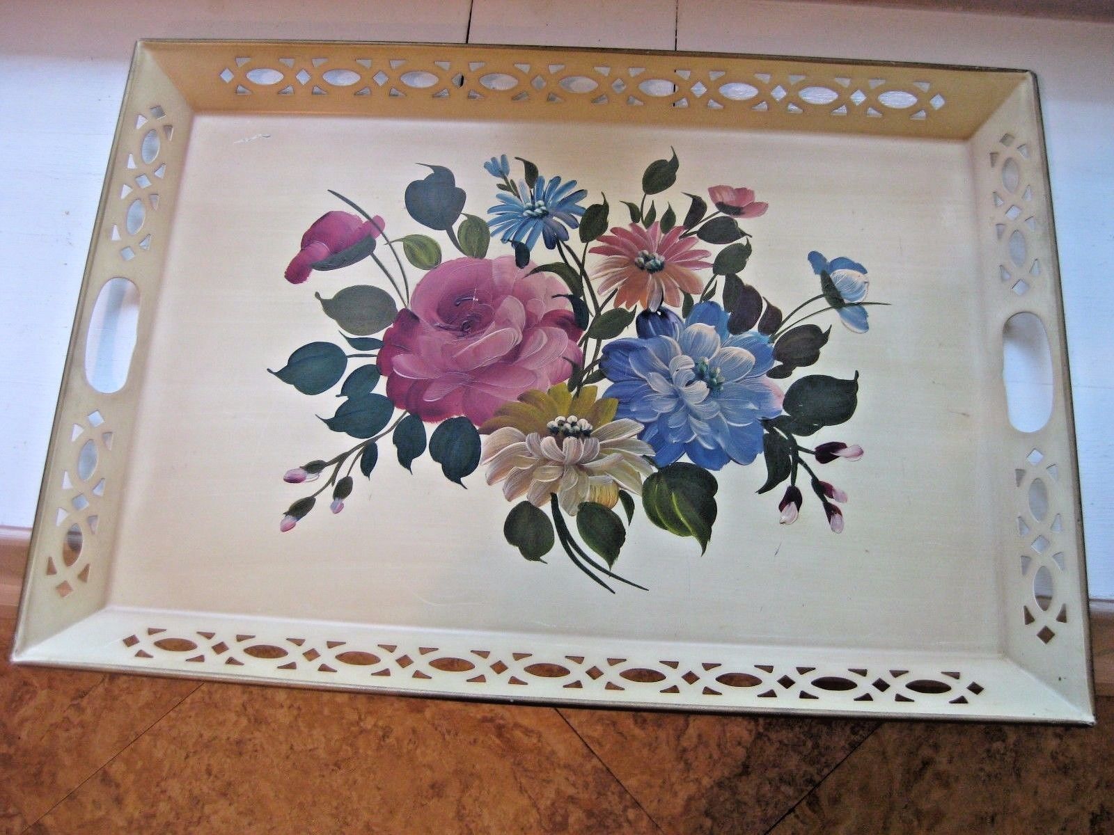 VTG EX.Large Pierced Toleware Tray Hand Painted Flowers 23.5 x 16"